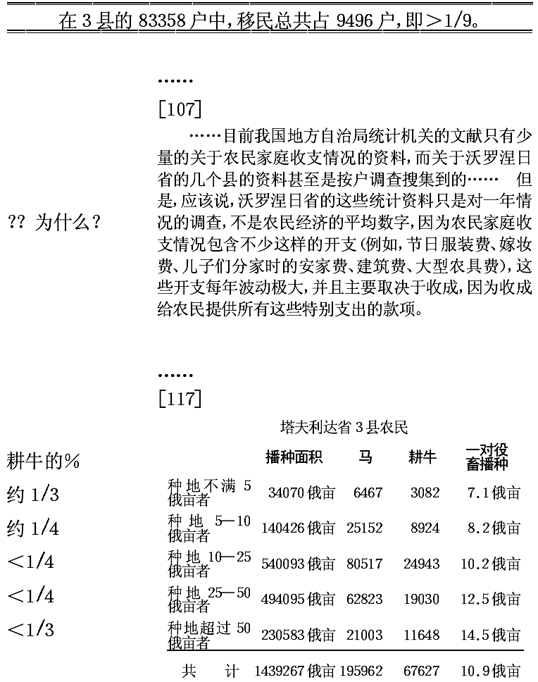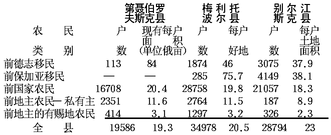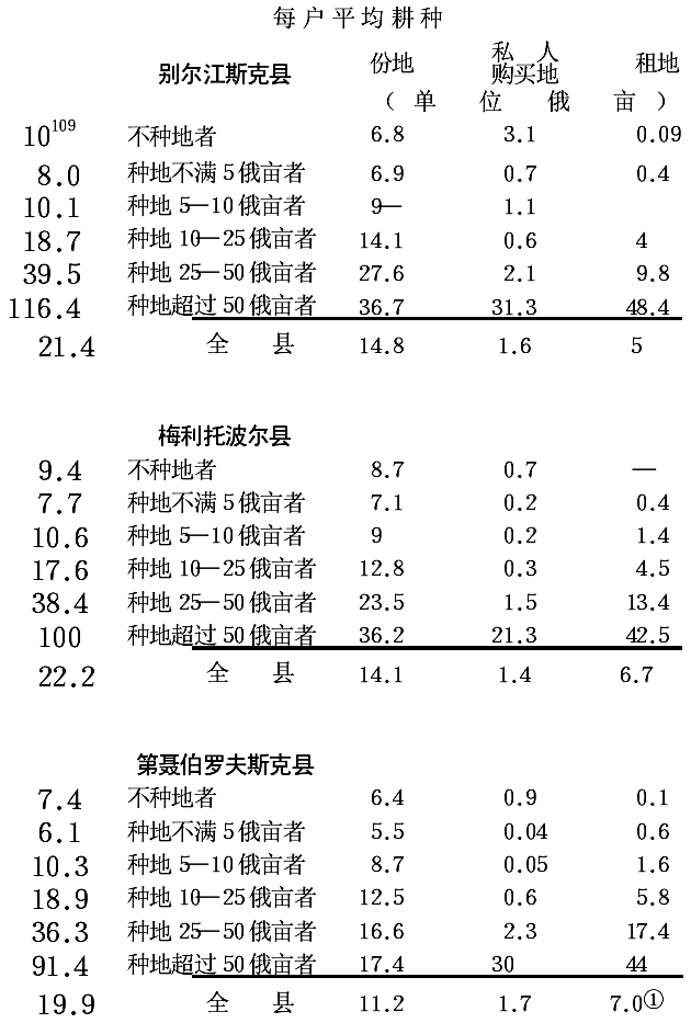 如果折算一下劳动力和播种面积的比例,我们就可得出各类农民每100俄亩播种面积分别有: