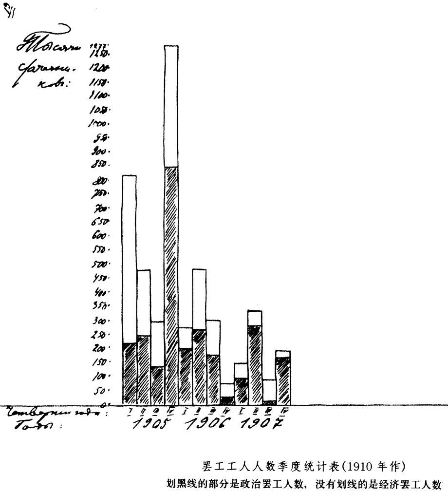在运动出现低潮的时候,经济罢工人数要比政治罢工人数下降得快。1906年,尤其是1907年的运动,其弱点无疑是缺少经济斗争的广泛可靠的基础。另一方面,政治罢工人数一般下降得较慢,尤其是1906―1907年下降得不多,这种情况看来是说明了一个我们所熟悉的现象:先进阶层以最大干劲来中止退却并且变退却为进攻。