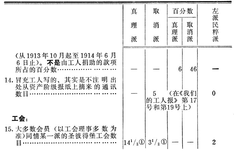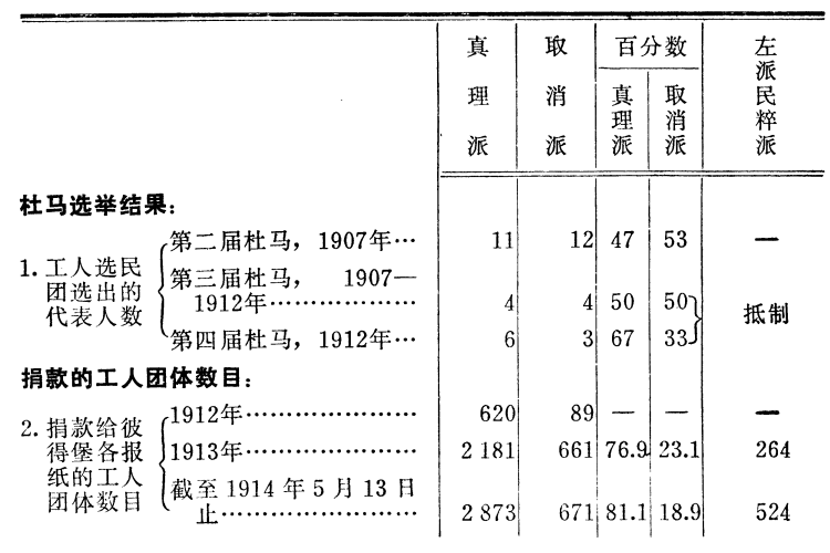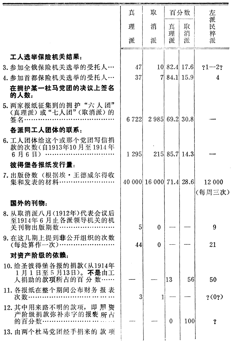 从客观材料得出的结论说明:只有真理派才真正是个不依赖资产阶级的、马克思主义的无产阶级派别,它组织了和联合了4/5以上的工人(同取消派相比,1914年真理派所团结的工人团体占总数81.1%)。取消派和民粹派无疑是两个派别,但却是资产阶级民主主义派别,而不是工人的派别。