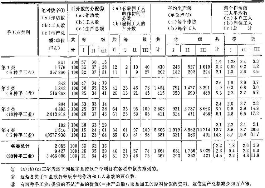 现在我们来考察一下,在工业小商品生产者中间形成的那些社会经济关系是怎样的。确定这些关系的性质这个任务同前面第2章中提出的研究小农的任务是一样的。现在我们应当依据的不是农业经营的规模,而是手工业经营的规模;应当把小手工业者按其生产规模加以分类,考察雇佣劳动在每一类中的作用、技术状况等等。(27)为了进行这种分析,必须有手工业者的按户调查资料,我们现在掌握的是莫斯科省手工业者的按户调查资料。(28)调查人员对许多手工业都列举了有关每一个手工业者的生产、有时还包括其农业的确切统计资料(作坊建立时间,本户工人和雇佣工人的人数,全年生产总额,手工业者拥有的马匹数目,耕种土地的方法等等)。在这里,调查人员并未提供任何分类表,因此我们必须自己来编制这些表,按照每一作坊的工人人数(本户工人和雇佣工人),有时按照生产规模及其技术设备等等,把每一种行业的手工业者都划分成等级(Ⅰ是低级,Ⅱ是中级,Ⅲ是高级)。一般说来,手工业者分级的标准,是按照关于这种手工业的记载中所引用的全部资料来确定的;此外,在不同的手工业中,必须采用不同的标准来划分手工业者的等级。例如,在很小的手工业中,把有1个工人的作坊列为低级,把有2个工人的作坊列为中级,把有3个工人以上的作坊列为高级,而在较大的手工业中,则把有1—5个工人的作坊列为低级,把有6—10个工人的作坊列为中级,依此类推。如果不采用不同的分类法,我们就不可能对每一种手工业提供出关于不同规模的作坊的资料。用这种方法制成的表载于附录中(见附录一);表中指出了每一种行业的手工业者是根据什么标志划分成各种等级的,列举出了每一种行业中每一等级的作坊、工人(包括本户工人和雇佣工人)、生产总额、有雇佣工人的作坊、雇佣工人等的绝对数字;为了说明手工业者的农业状况,计算出了每一等级中每一个业主占有马匹的平均数字以及靠“工人”来耕种土地(即雇用农业工人)的手工业者的百分数。这个表共包括37种手工业、2278个作坊、11833名工人和500万卢布以上的生产总额;如果把因资料不完备或因其性质特殊(29)而不列入汇总资料的4种手工业除去,则共有33种手工业、2085个作坊、9427名工人和3466000卢布的生产总额,经过订正(对两种手工业)以后,生产总额约为375万卢布。