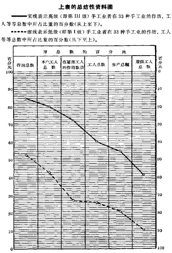 这个表汇总了高级和低级手工业者的关系的最主要资料,这些资料可供我们作出进一步的结论。关于这四类手工业的总结性资料,我们可以用图来说明,这个图的设计与我们在第2章中说明种地农民的分化的图完全相同。我们先算出每一等级的作坊总数、本户工人总数、有雇佣工人的作坊总数、工人(包括本户工人和雇佣工人)总数、生产总额和雇佣工人总数的百分数,然后把这些百分数(用第2章所说的方法)画在图上。FN2