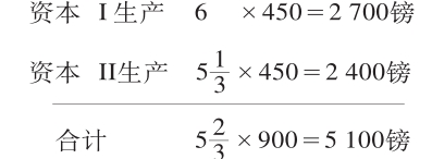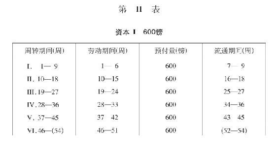 第一个周转期间12周。第一个劳动期间9周,其中预付资本的周转,在第13周开始时完成。最后3周有追加资本300镑执行职能,并且开始第二个9周的劳动期间。