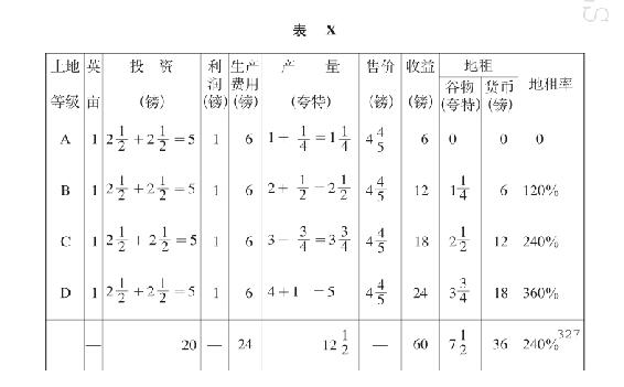 表X中的总收益、货币地租和地租率,也和表II,表VII,表VIII中的相同,因为产量和售价又按相反的比例变动,而投资不变。