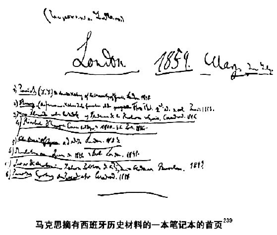 239 在马克思摘有西班牙问题的材料的一本笔记本的首页上,马克思曾亲笔记下了他所研究过的部分著作。现将能辨认出的原文刊在下面并译成中文: