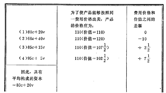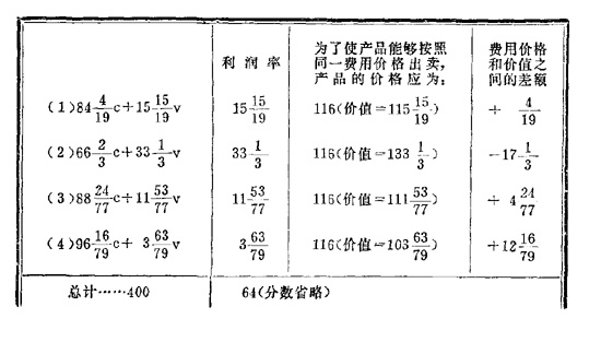 利润是16%,更确切些说,略高于[16+(1/7)]%。计算是不完全准确的,因为我们在计算平均利润时,把分数省略了,在进一步计算时没有包括在内,因此,(2)的负差大了一些,(1)、(3)、(4)的[正差]小了一些。但是,我们看到,如果计算精确,正差和负差就会相互抵销。但是我们也看到,一方面,(2)的低于本身价值出卖的商品,[另一方面](3)特别是(4)的高于本身价值出卖的商品都会大大增加。固然,对单位产品来说,这种高于或低于价值的程度不象表上的数字那么大,因为在所有这四类里,都使用了[比以前]更多的劳动量,因而有更多的不变资本(原料和机器)转化为产品;所以上述这种高于或低于价值的数字是分摊在更大量的商品上。不过,这种高于或低于价值的情况还是很显著的。