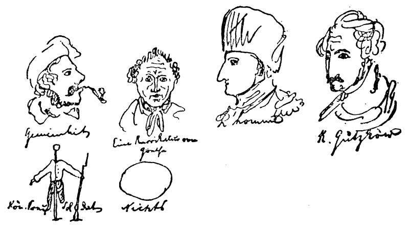 FN10 插图下的说明(自左至右):Gemeinheit(低级趣味);Eine Karrikatur von Goethe(歌德的漫画像);L’homme(人);K.Gutzkow(卡·谷兹科夫);Kön.Preuß.Soldat(普鲁士王国士兵);Nichts(子虚乌有)。——编者注